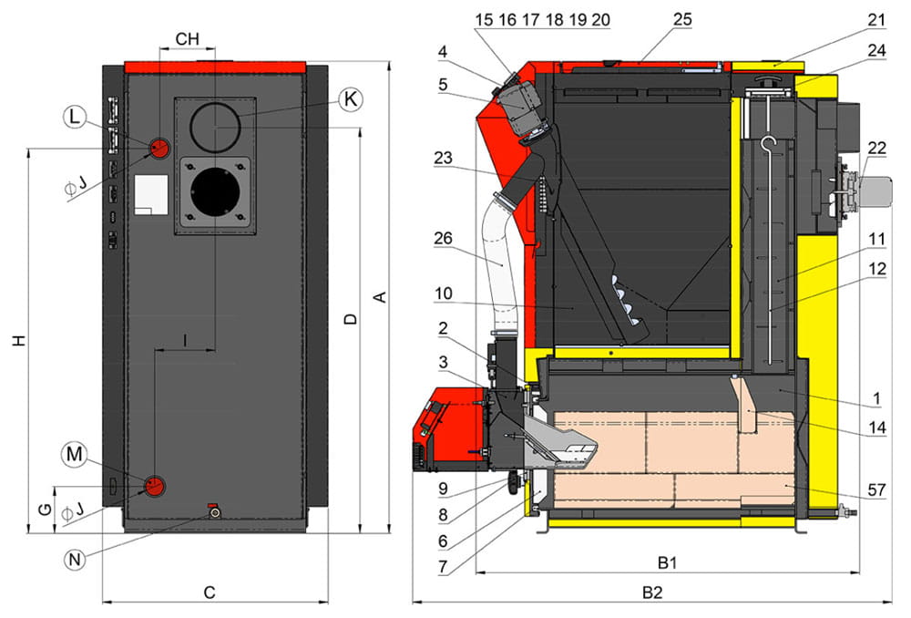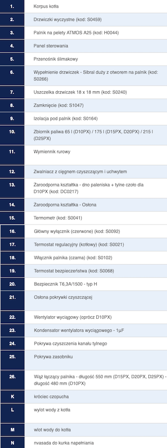 podajnikiem oraz zasobnikiem pelletu o pojemności 65 L(D10PX) / 175 L(D15PX, D20PX) / 215 L(D25PX).