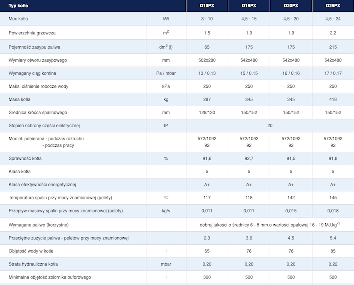 podajnikiem oraz zasobnikiem pelletu o pojemności 65 L(D10PX) / 175 L(D15PX, D20PX) / 215 L(D25PX).