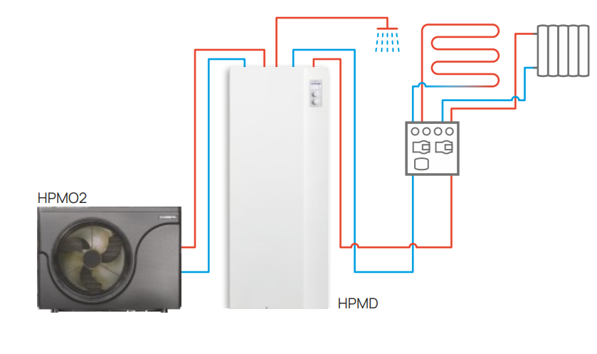 System z pompą ciepła HPM2.C-8 (jednostka zewnętrzna HPMO2-8 i jednostka wewnętrzna 3w1 HPMD-8)